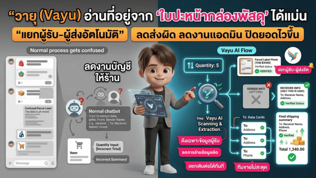 วายุ (Vayu) อ่านที่อยู่จาก “ใบปะหน้ากล่องพัสดุ” ได้แม่น: แยกผู้รับ–ผู้ส่งอัตโนมัติ ลดส่งผิด ลดงานแอดมิน ปิดยอดไวขึ้น | KlangTECH®️